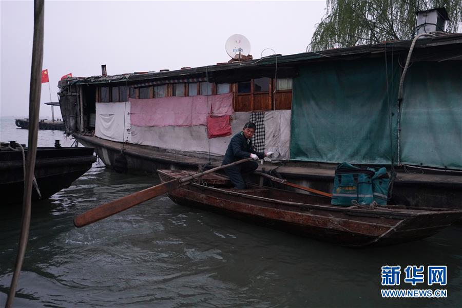 3月30日,唐真亚将小船划离岸边,准备前往送邮件。新华社记者 季春鹏 摄