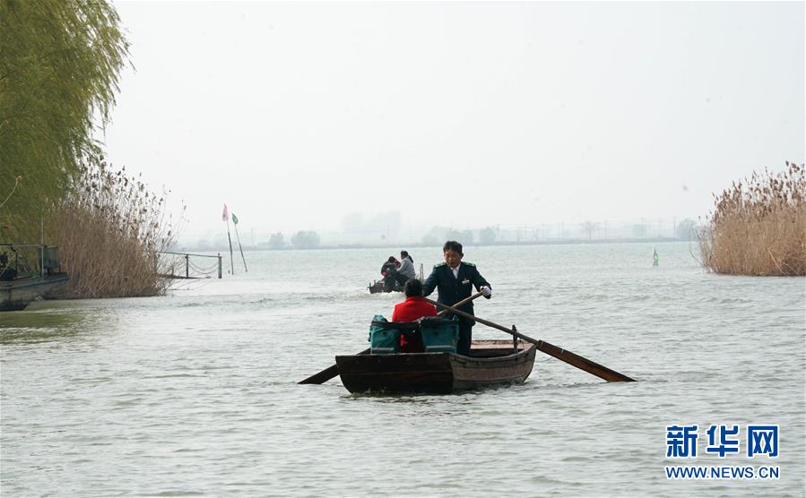 3月30日,唐真亚划船进入新滩村送邮件。新华社记者 黄晓勇 摄
