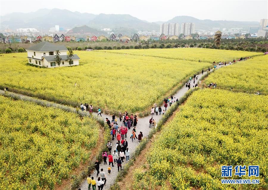 3月30日,游客在余庆县都市第三地生态园的油菜花田间游玩(无人机拍摄)。 当日,2019“醉美遵义·四季主题游”之“赏花季”余庆站活动在贵州省遵义市余庆县举行,吸引众多游客前来观花赏景。 新华社记者 杨文斌 摄