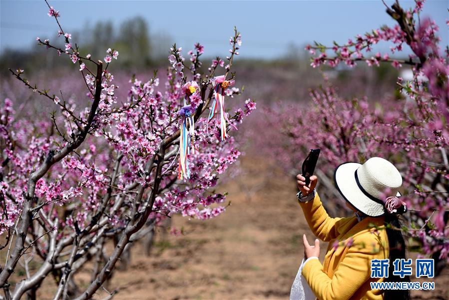 3月30日,游客在郯城县马头镇桑庄村的“农家花园”里赏花拍照。新华社发(房德华 摄)