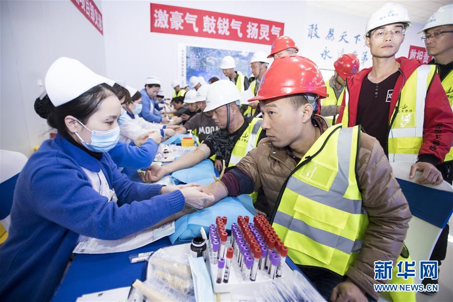 3月31日,医护人员对建设工人进行抽血检查。 新华社记者肖艺九摄