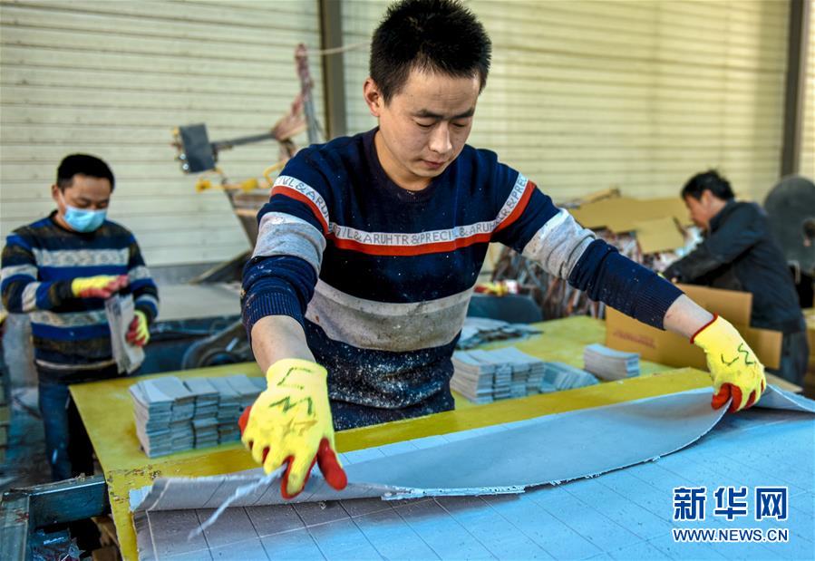 3月31日,阜城县一家玻纤制品企业职工在加工生产柔性石材劈开砖。 新华社记者李晓果摄