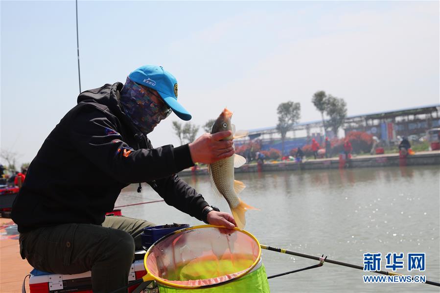 3月31日,一名钓鱼爱好者在比赛中钓上一条鱼。当日,来自全国各地的近千名钓鱼爱好者在江苏省泗洪县洪泽湖湿地国际垂钓中心大圆塘参加垂钓大赛。新华社发(许昌亮 摄)
