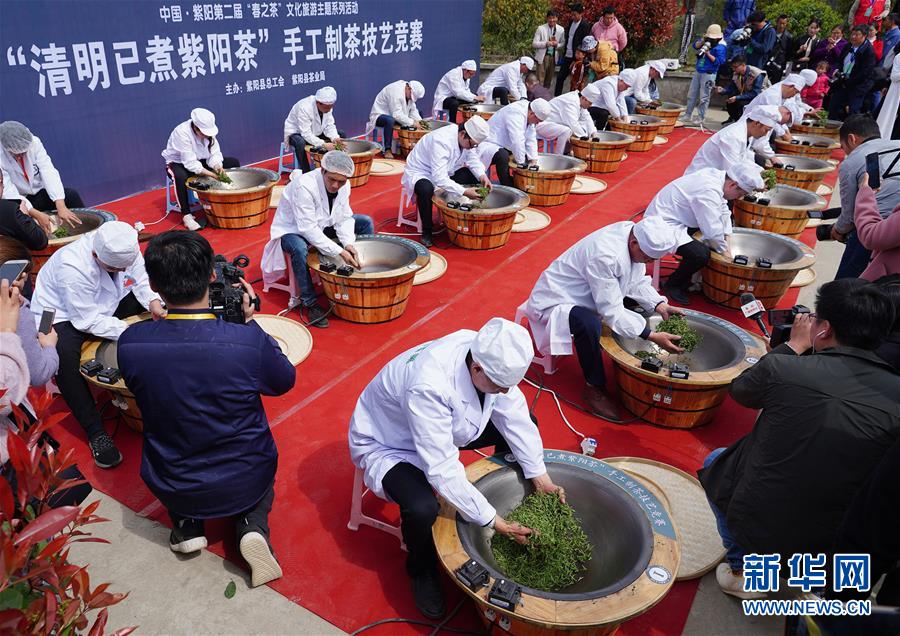 手工茶制作技艺大赛在紫阳县向阳镇合垭村一处茶园里举行(3月31日摄)。 时下,陕西安康市紫阳县进入春茶采摘期,当地举办系列文化旅游活动,吸引游客上茶山游玩,享受田园惬意。近年来,紫阳县依托茶园基地建设着力打造生态观光园,积极推动茶旅融合发展,取得良好效果。 新华社记者 邵瑞 摄