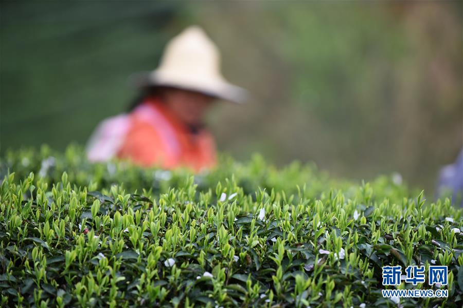 3月31日,采茶工在贵州省余庆县松烟镇一处茶场采摘“明前茶”。随着气温回升,贵州省遵义市余庆县各大茶场迎来“明前茶”采摘高峰。采茶工人忙着采摘、制茶,供应市场。新华社记者 杨文斌 摄