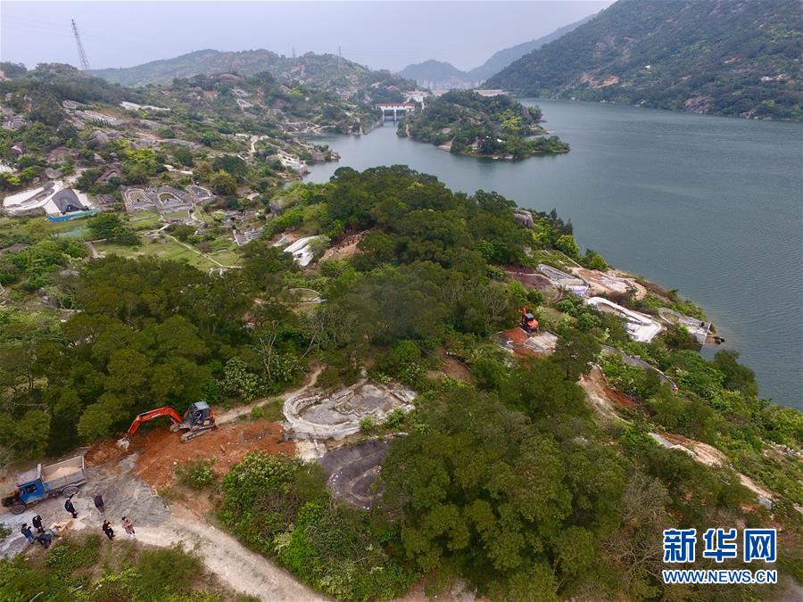 3月31日,工作人员在福州市长乐区三溪水库边整治违建坟墓。