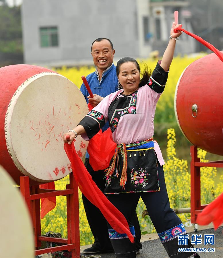 3月31日,在湖南湘西花垣县麻栗场镇新科村,苗族群众在打苗鼓。当天,湖南省湘西土家族苗族自治州花垣县举办一年一度的“桃花会”活动,打苗鼓、唱苗歌、坐“八人秋”等传统文化活动吸引众多游客。新华社发(龙恩泽 摄)
