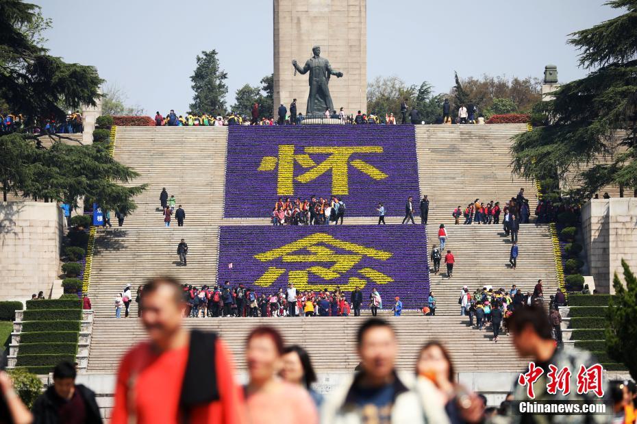 4月1日,南京雨花台烈士纪念碑前布置的“怀念”花坛。清明节将至,南京雨花台烈士陵园的烈士纪念碑前布置了由数万盆鲜花组成的“怀念”花坛。许多市民、学生和外地游客来到这里参观凭吊,缅怀革命先烈。中新社记者 泱波 摄