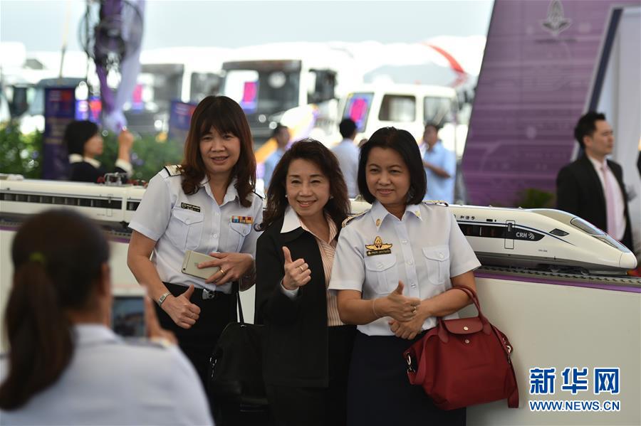 这是在泰国大城府邦芭茵县清惹克侬站,人们在中泰铁路合作项目启动仪式上与中国高速铁路动车“和谐号”模型合影(2015年12月19日摄)。新华社记者李芒茫摄