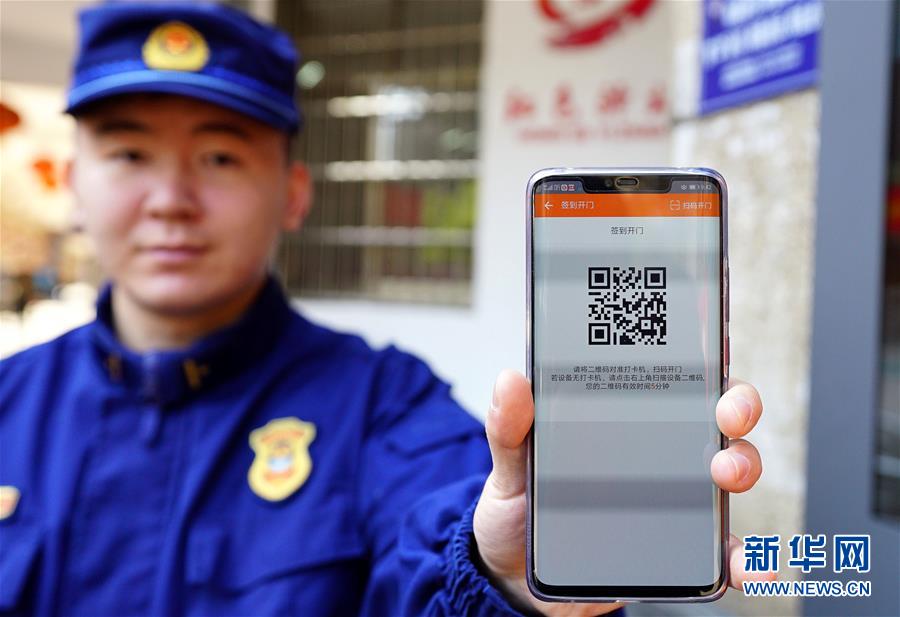 4月1日,在红谷滩新区凤凰家园社区,消防员在展示微型智能应急服务站的使用方法。通过手机下载软件,扫码开门就可使用设备。新华社记者 彭昭之 摄
