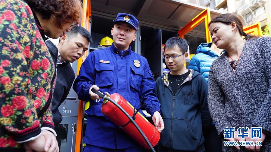 4月1日,在红谷滩新区凤凰家园社区,消防员在为居民介绍灭火器的特点及使用方法。新华社记者 彭昭之 摄