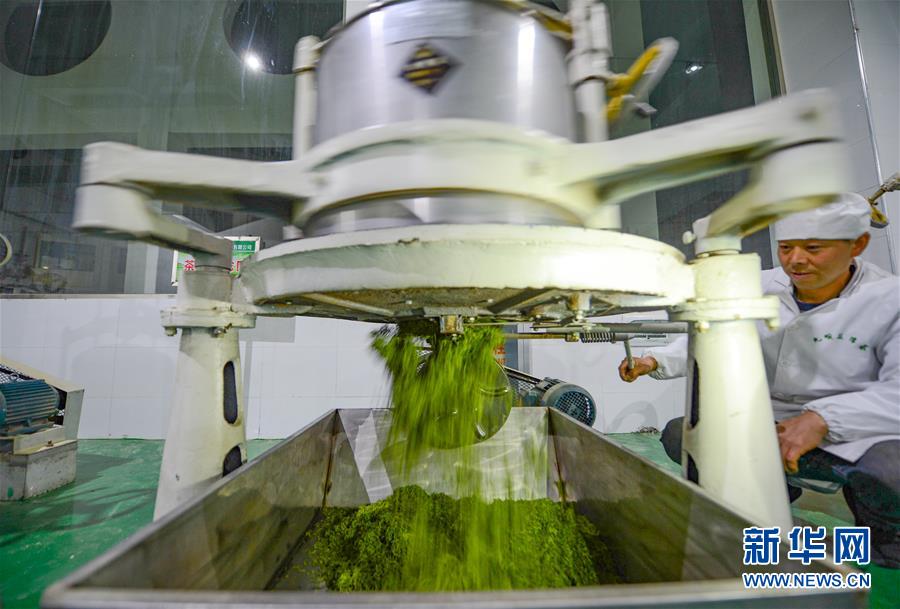 4月2日,在秭归县九畹丝绵茶自动化生产车间,制茶师在加工茶叶。清明将至,位于长江三峡库区湖北省宜昌市秭归县的九畹丝绵茶进入采摘加工高峰期。秭归县种植九畹丝绵茶一万多亩,带动一千多户农民增收致富。 新华社发(雷勇 摄)