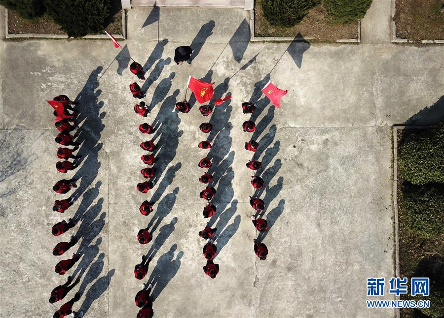 胡兆伦在烈士陵园为前来扫墓的小学生讲解烈士的事迹(3月14日无人机拍摄)。 新华社记者刘军喜摄