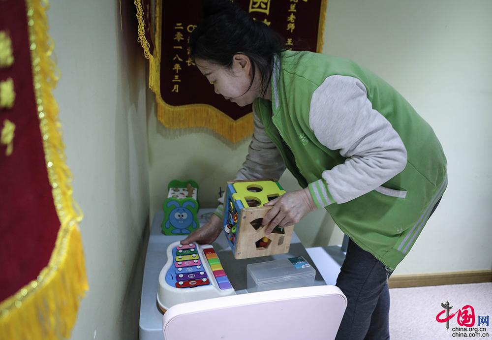 曹芳曾在北医六院儿童病房从事20多年的护理工作,退休之后来到北大医疗脑健康儿童发展中心。从护理工作转入孤独症康复一线工作,对曹芳来说还有很多要学习,但多年的儿童护理工作经验也让她有更多的心得和体会。除了安慰家长,由于孤独症儿童通常无法很好地控制自己的情绪,曹芳也会用一些小玩具来安抚孩子们,或者先冷处理,等孩子的情绪发作一段时间之后再进行劝说和安慰,慢慢过渡到正常的交谈中。中国网记者 伦晓璇 摄