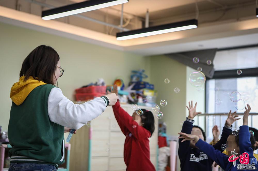 随着康复干预的推进,于莹开始走入孩子们的世界。让于莹记忆深刻的,是一个叫皮皮(化名)的小男孩。初次见面,当于莹要去接近他时,对陌生人的抗拒使他本能地跑开了,皮皮的妈妈生气地打了他一巴掌,但他也并未像其他的孩子一样嚎啕大哭,而只是轻轻抹去眼泪,继续玩手中的玩具小汽车。看着皮皮倔强的眼神,于莹开始思考用什么样的方式才能让皮皮接纳自己。结合针对皮皮的教学计划,于莹也开始试着去和皮皮进行互动,比如一起做游戏、玩玩具。起初皮皮也不愿配合,但突然有一天,皮皮把他的小汽车放到了于莹手中,当于莹从惊讶中缓过神,皮皮已经抱住了于莹。从那一刻起,于莹跟皮皮成为了好朋友。中国网记者 伦晓璇 摄