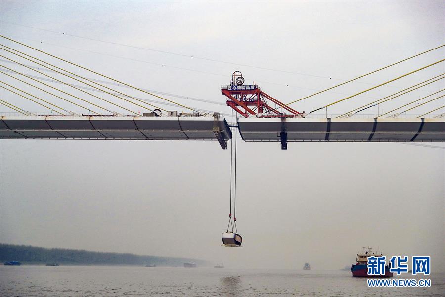 工人在池州长江公路大桥施工现场吊装最后一块钢箱梁(3月29日摄)。 新华社记者曹力摄