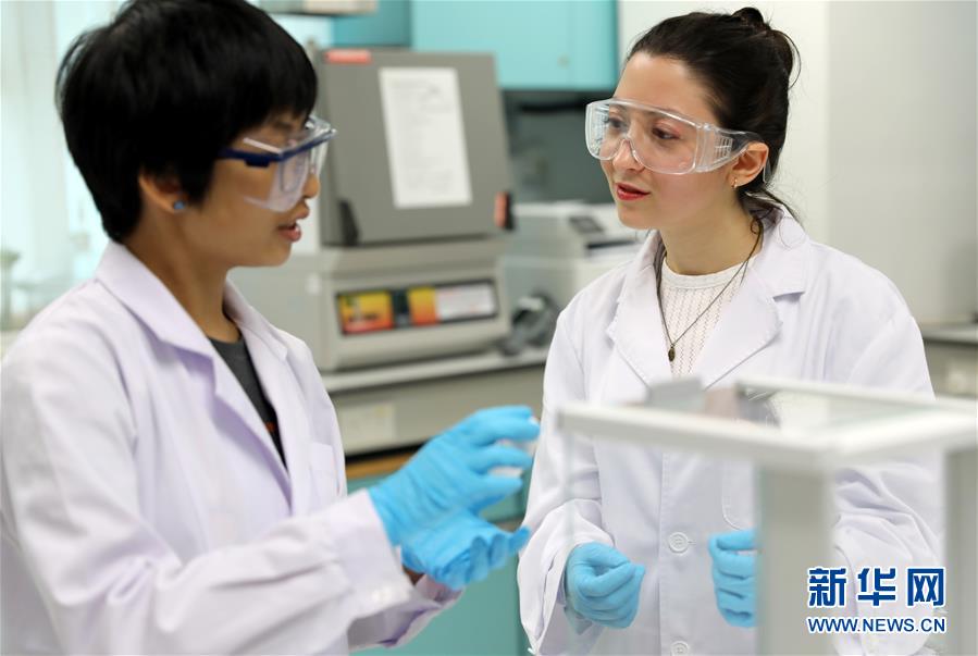 恰肯(右)与同学一起做实验(3月26日摄)。新华社记者 吴晓初 摄
