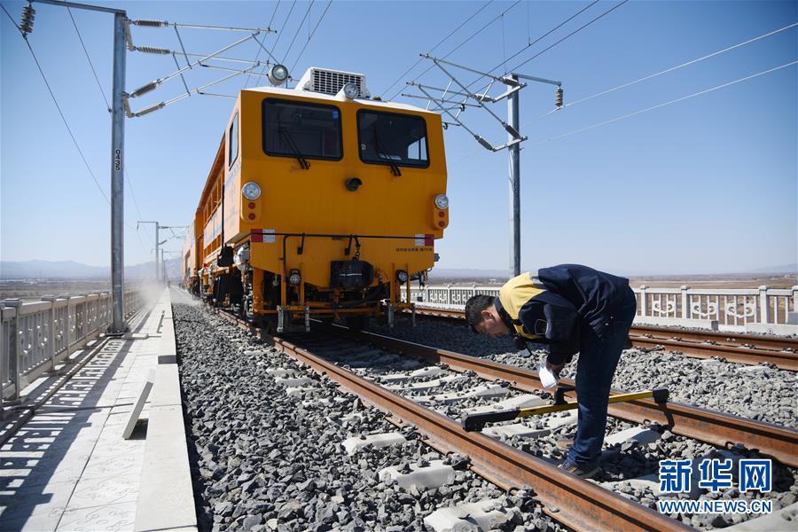 4月2日,中铁呼和浩特局集团有限公司的铁路工人在张呼高铁兴和段测量轨距。 新华社记者 彭源 摄