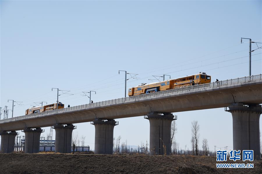 4月2日,中铁呼和浩特局集团有限公司的大型养路机械车对张呼高铁线路进行捣固作业。 新华社记者 彭源 摄