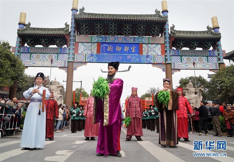 4月2日,参加巡游的演员在开封市宋都御街前表演。新华社记者 李安 摄