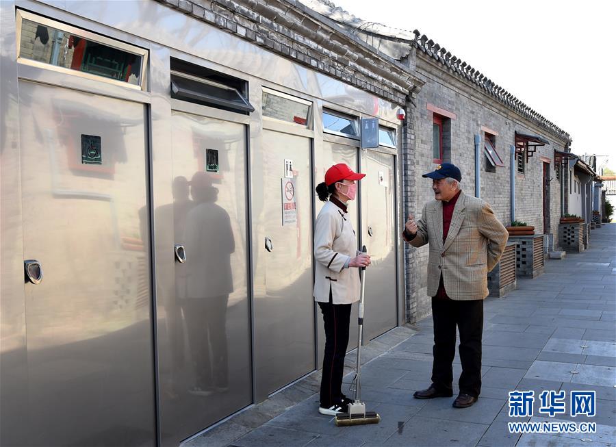 侯雅明(右)与公厕卫生管理人员交流改造后公厕的体验(4月1日摄)。 新华社发(任超 摄)