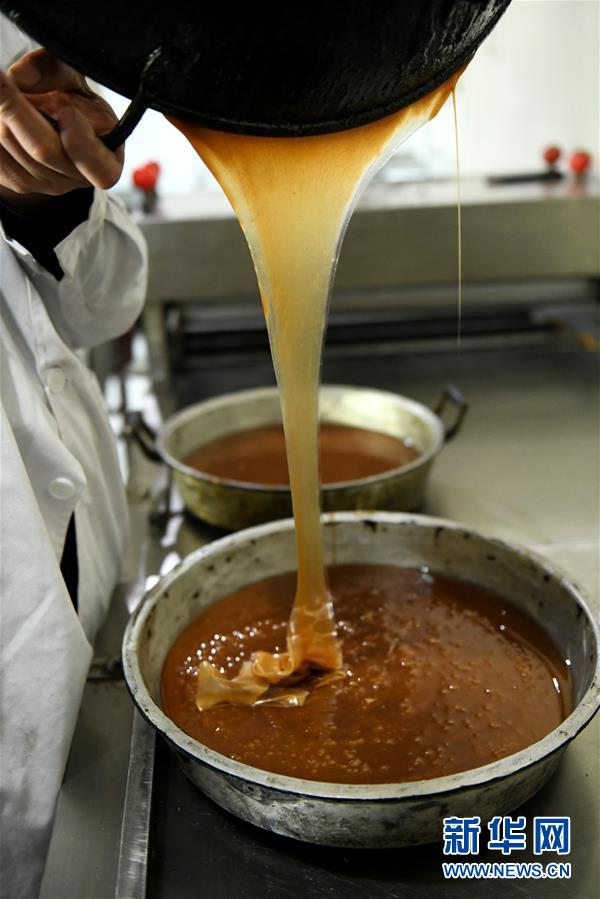 4月2日,在石家庄晋州市西旺村,晋州市传统酥糖手工制作技艺传承人郭松在制作酥糖。 新华社发(陈其保 摄)