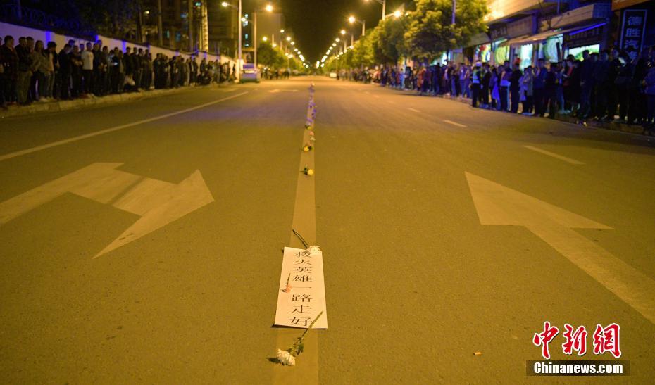 4月2日深夜,四川西昌,车队途经路段街道中央摆放着“救火英雄一路走好!”的挽言和菊花。四川凉山州木里县雅砻江镇立尔村境内的“3·30”森林火灾中最后一批6名牺牲人员遗体于当日运抵西昌。此前已有23名牺牲人员遗体抵达西昌殡仪馆。另有一名牺牲人员遗体随家属意愿留在当地安葬。中新社记者 刘忠俊 摄