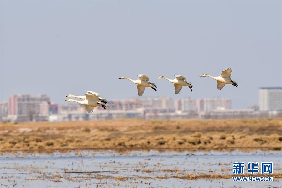天鹅在杭锦旗独贵塔拉镇的黄河浅滩上飞翔(4月2日摄)。 近日,内蒙古自治区杭锦旗独贵塔拉镇的黄河浅滩迎来一批天鹅到此栖息,成为当地一景。 新华社记者 刘磊 摄