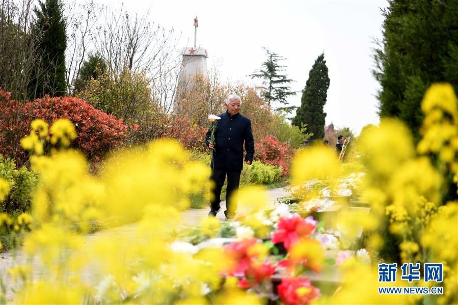 4月2日,年介涛在陈集镇胡刘烈士陵园为烈士扫墓。 新华社记者 刘军喜 摄