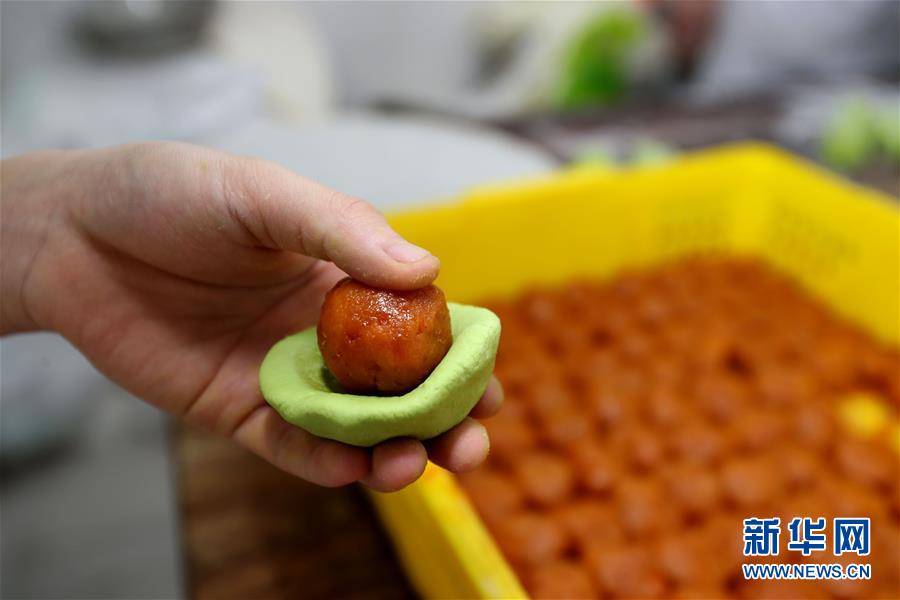 4月2日,“网红青团”的咸蛋黄肉松馅被包进面皮。新华社记者 刘颖 摄