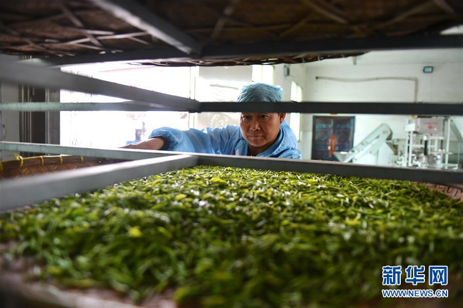 4月3日,浮梁县鹅湖镇界田村进来茶叶合作社的茶农在进行摊青工序。 日前,江西浮梁县绿茶迎来全面开采期,茶园里一派忙碌景象。近年来,江西浮梁县依托生态优势,大力发展茶产业。目前,全县共有茶园近16万亩,通过开展“公司+合作社+农户”的产业模式,带动全县350余户实现脱贫致富。 新华社记者 胡晨欢 摄