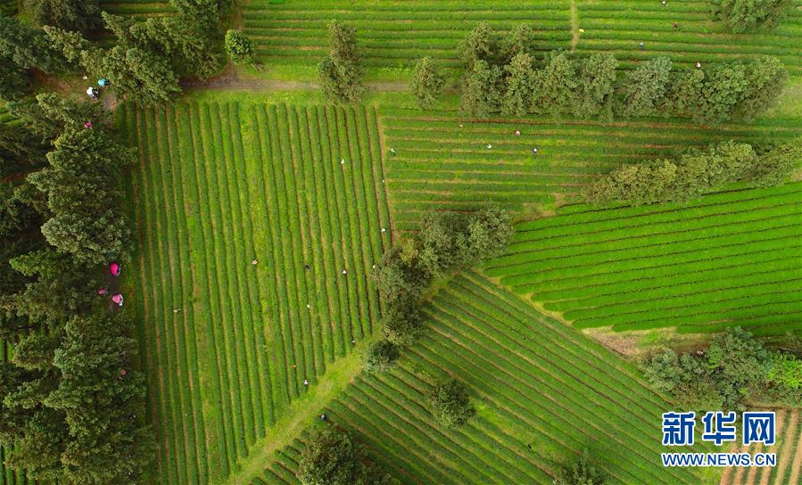 4月3日,浮梁县臧湾乡茶农在新佳茶园基地采茶(无人机拍摄)。 日前,江西浮梁县绿茶迎来全面开采期,茶园里一派忙碌景象。近年来,江西浮梁县依托生态优势,大力发展茶产业。目前,全县共有茶园近16万亩,通过开展“公司+合作社+农户”的产业模式,带动全县350余户实现脱贫致富。 新华社记者 胡晨欢 摄