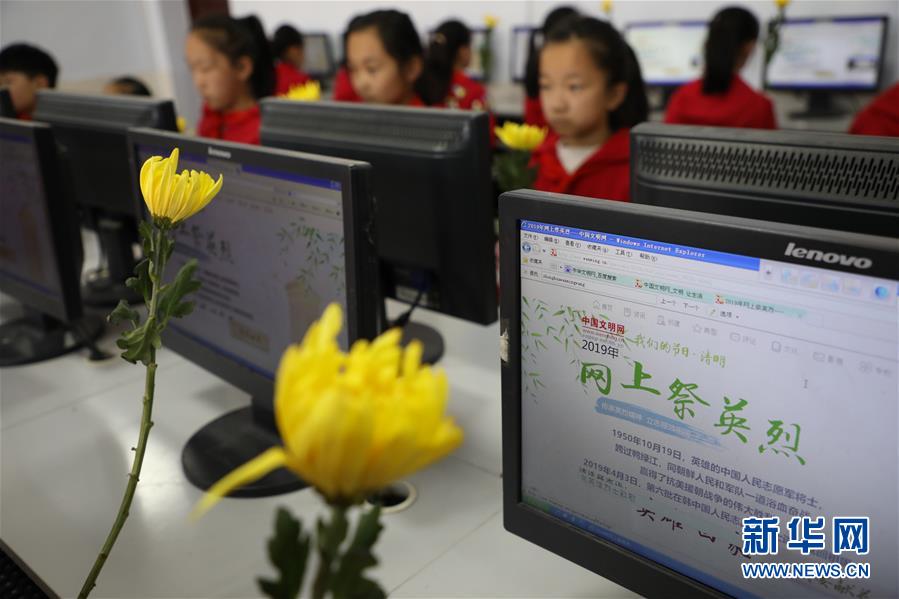4月3日,山东省滨州市博兴县第一小学学生通过网络祭奠英烈。新华社发(陈彬 摄)
