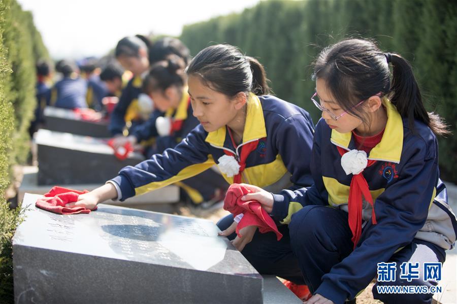 4月3日,山东省淄博市高青县田镇中心小学学生在革命烈士陵园擦拭烈士墓碑。新华社发(张维堂 摄)