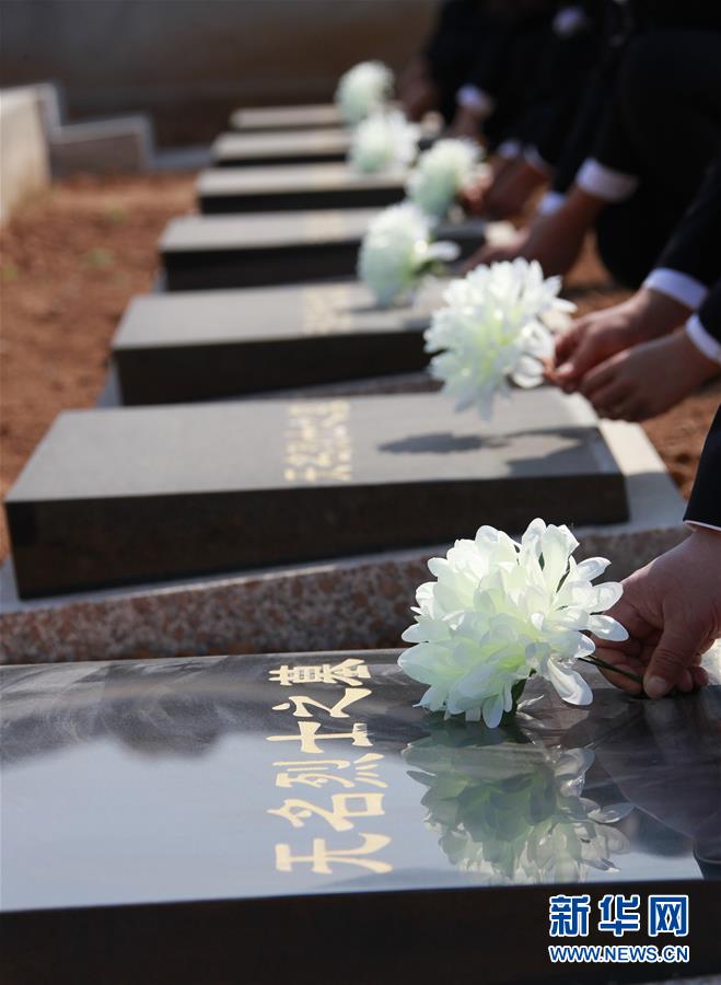 4月3日,人们在河北唐山遵化市地北头镇鲁家峪抗日纪念馆向无名烈士墓敬献白花。新华社发(刘满仓 摄)