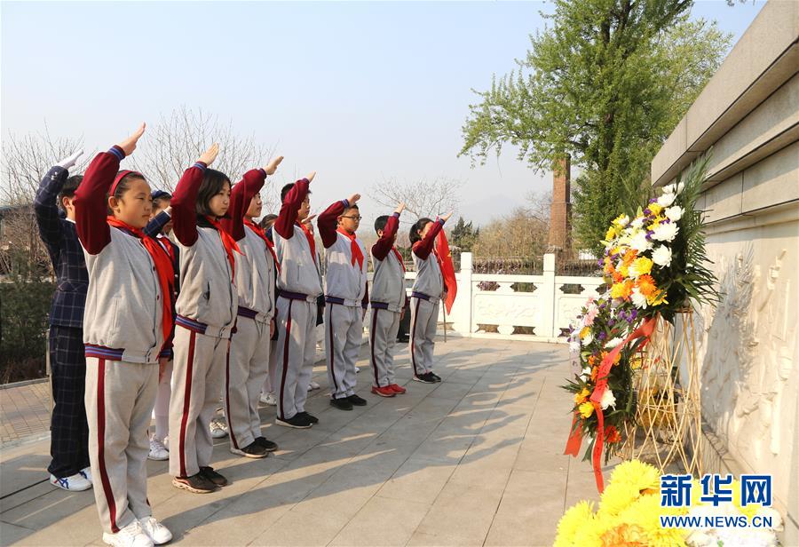 4月3日,石家庄市井陉矿区第一小学学生在革命烈士纪念碑前敬礼。新华社发(吴寅虎 摄)