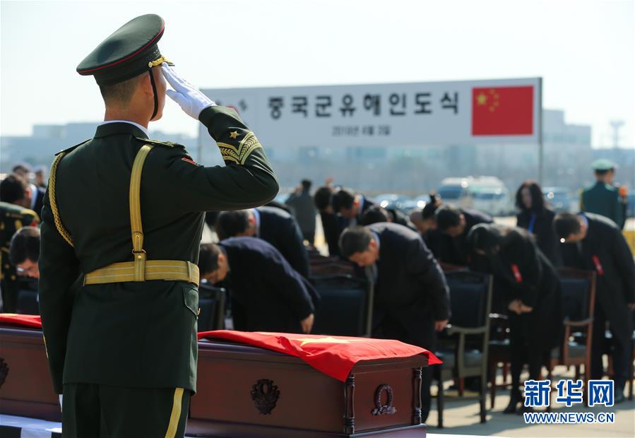 4月3日,在韩国仁川国际机场,人们向烈士遗骸鞠躬致敬。 中韩双方3日在韩国仁川国际机场举行第六批在韩中国人民志愿军烈士遗骸交接仪式。 新华社记者 王婧嫱 摄