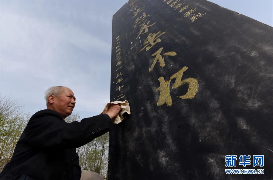 4月3日,马东春在“战地医院纪念园”内清洁纪念碑。新华社记者 朱旭东 摄