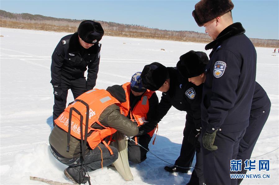 4月2日,黑龙江省出入境边防检查总站塔河县边境管理大队民警在爆破现场了解爆破实施情况。新华社发(褚福超 摄)