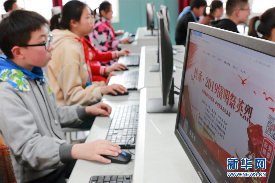4月3日,江苏省无锡市扬名中心小学的学生在参加网上祭英烈活动。 新华社发(汤毅 摄)