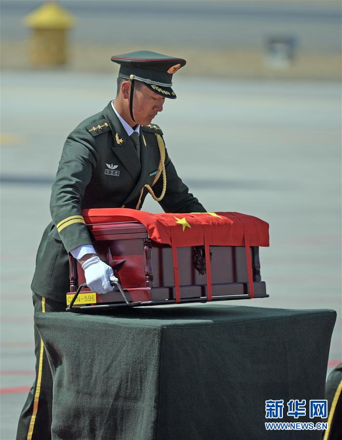 4月3日,在沈阳桃仙国际机场,礼兵将殓放志愿军烈士遗骸的棺椁从专机上护送至棺椁摆放区。新华社记者 杨青 摄