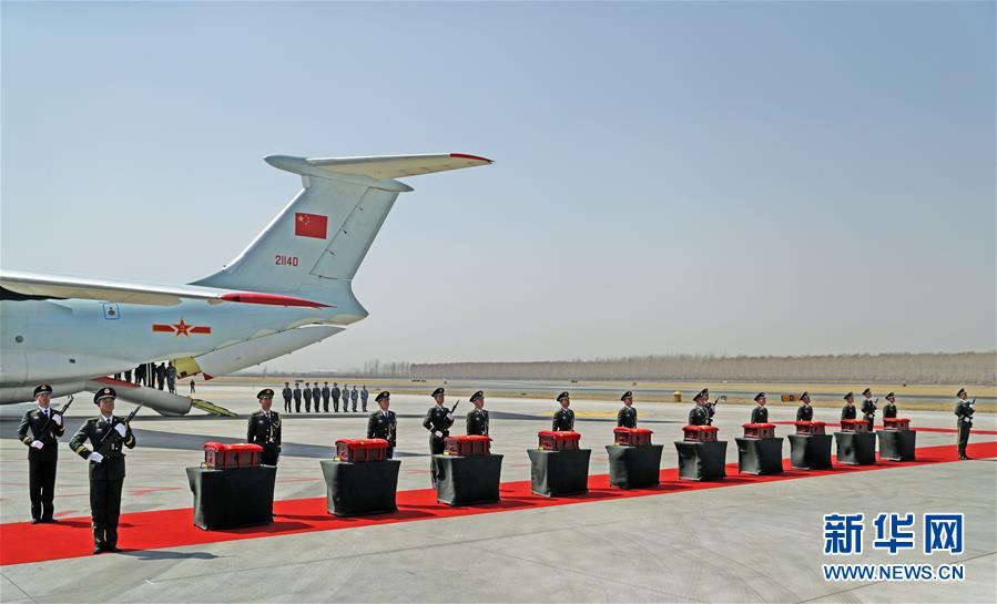 4月3日,在沈阳桃仙国际机场,礼兵将殓放志愿军烈士遗骸的棺椁从专机上护送至棺椁摆放区。新华社记者 杨青 摄