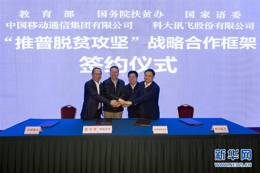 4月3日,代表在会议上签署《“推普脱贫攻坚”战略合作框架》后合影。 当日,2019年全国语言文字工作会议暨推普脱贫攻坚中期推进会在云南昆明召开。 新华社记者 沈伯韩 摄