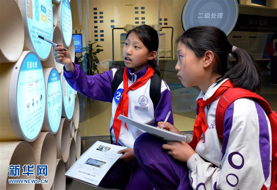 4月3日,来自清华大学附属中学的马好好(右)和来自清华大学附属中学上地小学的陈雨萱在了解现代化污水处理。 当日,“我和我的祖国 科技伴我成长”主题教育活动暨第二届科技节在北京科学中心举行,来自北京市海淀区上地学区的7所中小学参加。本次活动采用现场融合组队、游戏闯关的形式,让学生感受科学的魅力和科技的力量。 新华社发(任超 摄)