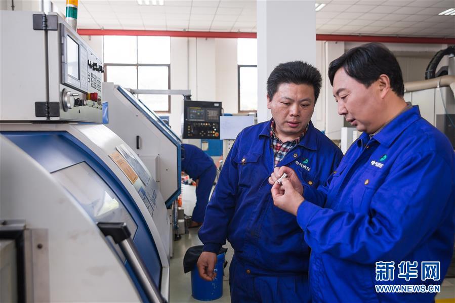 这是李斌(右)在查看工友加工的零件质量(资料照片)。新华社发
