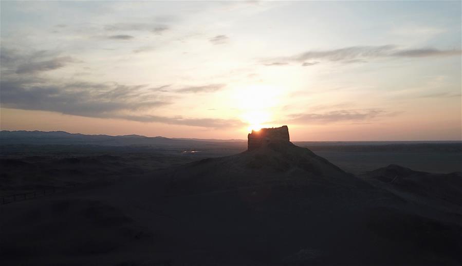 这是夕阳中的阳关烽燧遗址(4月3日无人机拍摄)。新华社记者 陈斌 摄