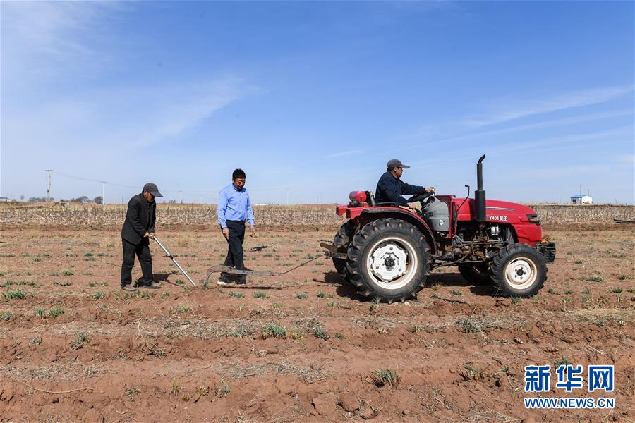 4月3日,在道劳呼都格嘎查,郭鸿嶂(中)和工人一起在红葱种苗地里取苗。内蒙古自治区杭锦旗道劳呼都格嘎查地处库布其沙漠边缘,自然条件恶劣。近年来,当地村民郭鸿嶂积极探索沙地红葱种植技术,他不仅将经验传授给当地农牧民,还成立红葱种植合作社,直接带动34户社员致富,其中6户建档立卡贫困户实现脱贫。 新华社记者 刘磊 摄