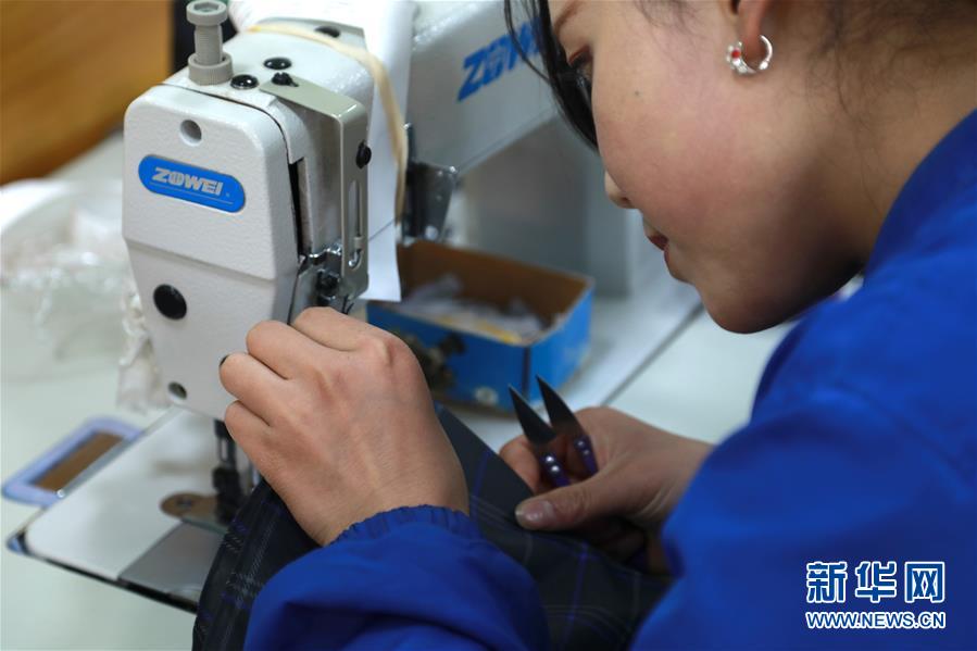 4月3日,在东乡族自治县振兴雨具扶贫车间,工人使用缝纫机加工雨伞伞面。新华社记者 李笑 摄
