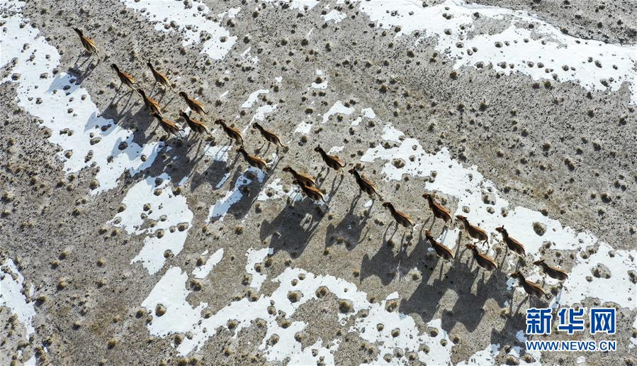 藏野驴在阿尔金山国家级自然保护区内奔跑(4月2日无人机拍摄)。新华社记者 胡虎虎 摄
