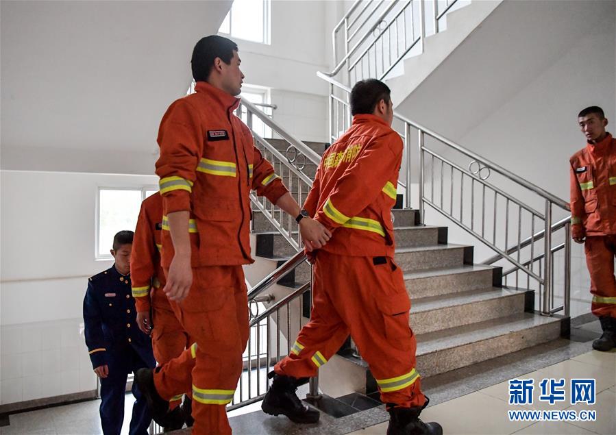 4月3日,四川森林消防总队凉山州支队西昌大队消防员走在大队楼道中。 新华社记者 张超群 摄